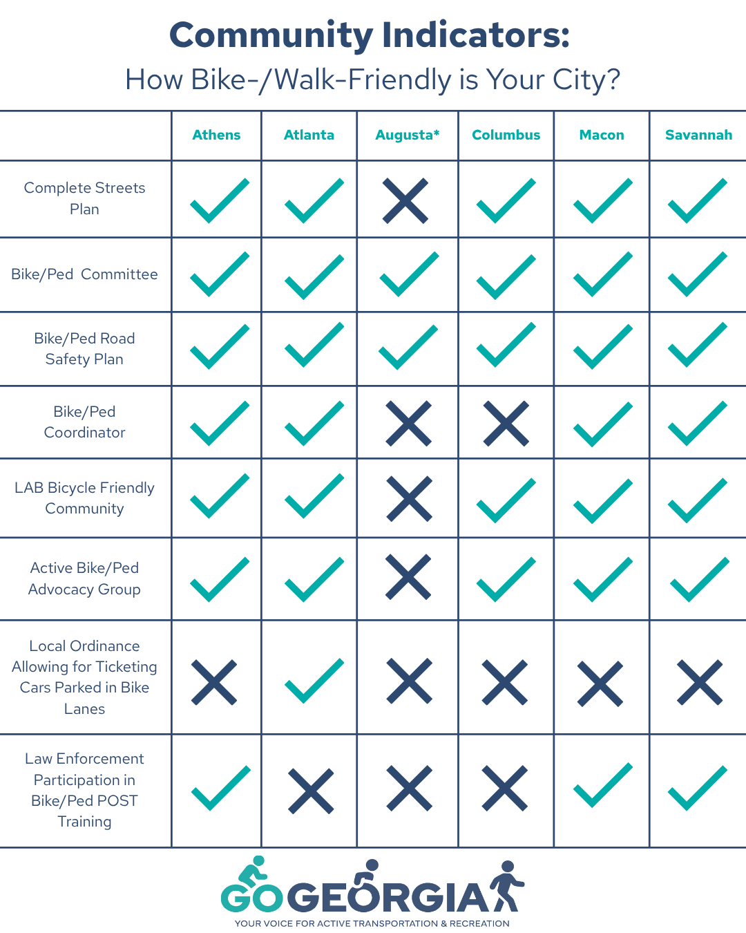To benchmark progress toward making Georgia a better place to bike, walk, and roll, we documented the bike-/walk-friendliness of our state's six largest cities. After researching each criterion extensively, we reached out to each community to ground-truth our findings (an asterisk next to the city name indicates a lack of response). Check out our comparison matrix above to see where each of them stack up!